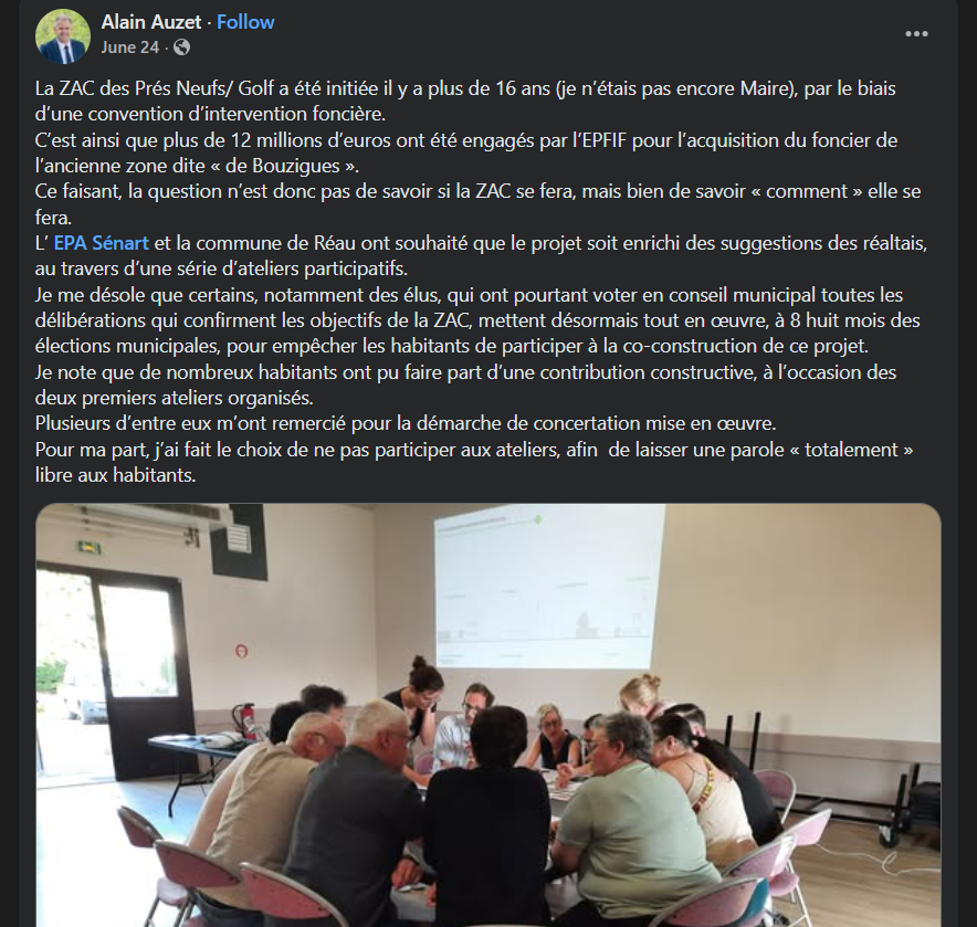 Une porte de sortie est bel et bien ouverte, mais on en oublierait presque la municipalité — pourtant représentée par son plus fervent porte-parole. Lors des ateliers de concertation sur la ZAC, en juin et juillet 2025, celui-ci affirme ne pas influencer les débats en n’y participant pas. Facile à dire, mais difficile à croire : il était bien présent à la réunion de lancement. Et surtout, en pleine phase de concertation, il lâche une déclaration pour le moins alarmante :