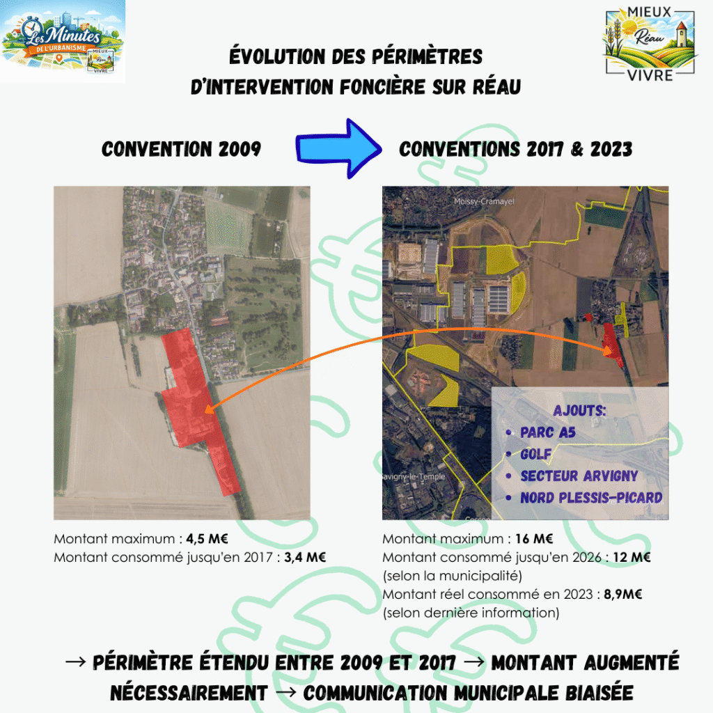 Ce que la municipalité dit beaucoup moins, c’est qu’à partir de 2017, une nouvelle convention, sous l’égide de l’exécutif municipal actuel, a largement étendu le périmètre : golf, parc A5, nord du Plessis-Picard, secteur voisin d’Arvigny…
